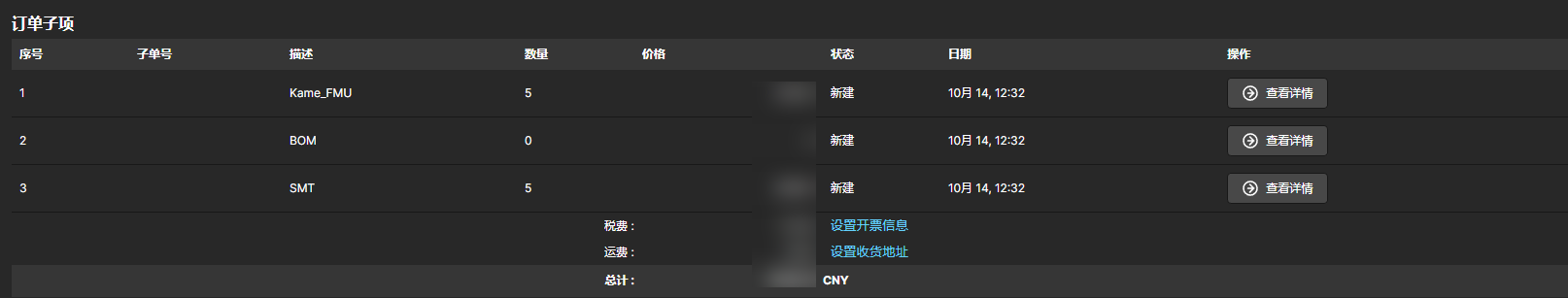 此区域主要显示订单对应的制板厂商和订单价格,跟随订单状态的变化将同时显示其它信息,比如生产阶段订单会同时显示订单号。